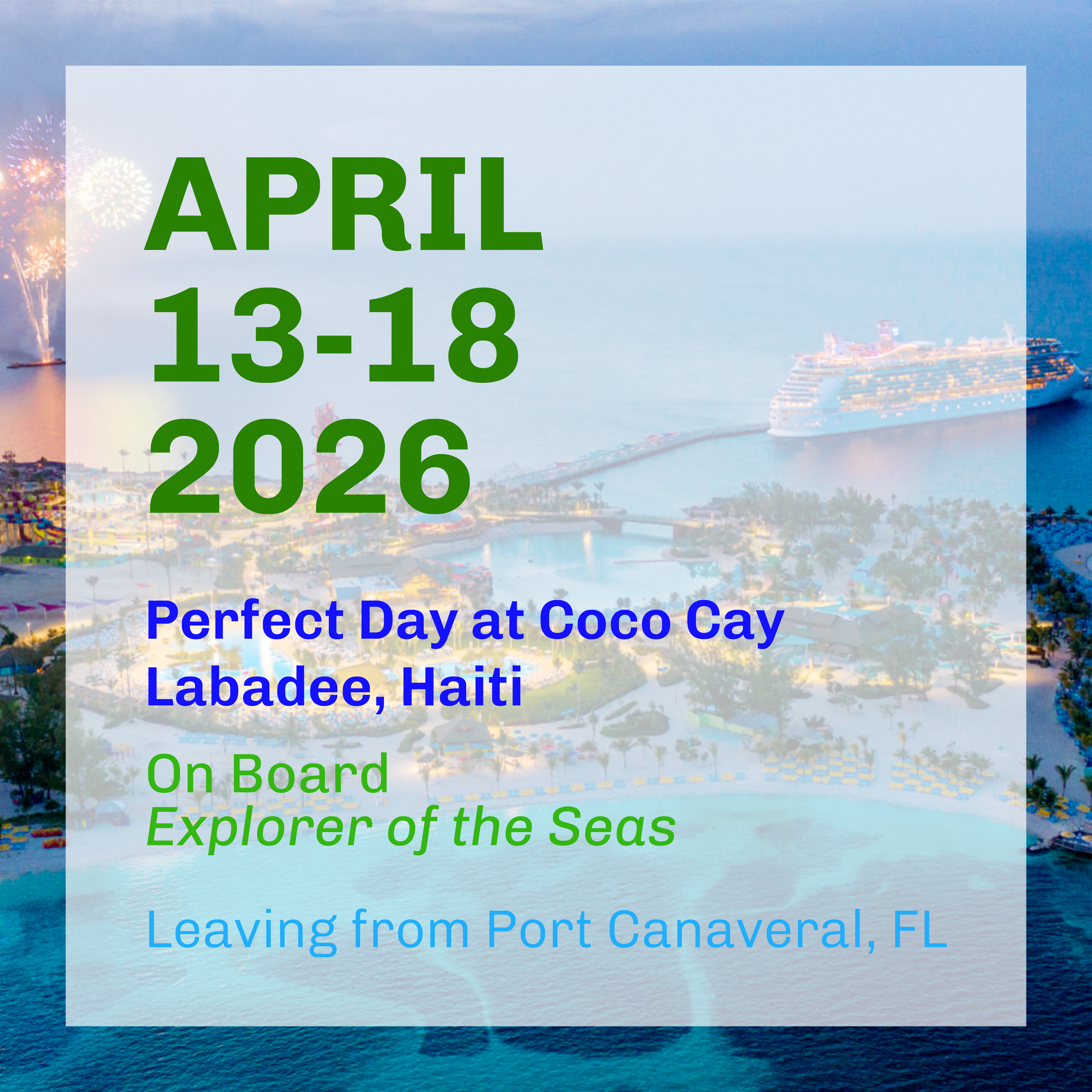 Join us from April 13-18, 2026. We'll depart from Port Canaveral, Florida, with ports of call in Labadee, Haiti, and Perfect Day at CocoCay, Bahamas. Both locations are Royal Caribbean's private destinations. Along the way we'll have a well-rounded menu of educational sessions to accomodate your time on the ship while providing networking opportunities outside of the scheduled sessions.